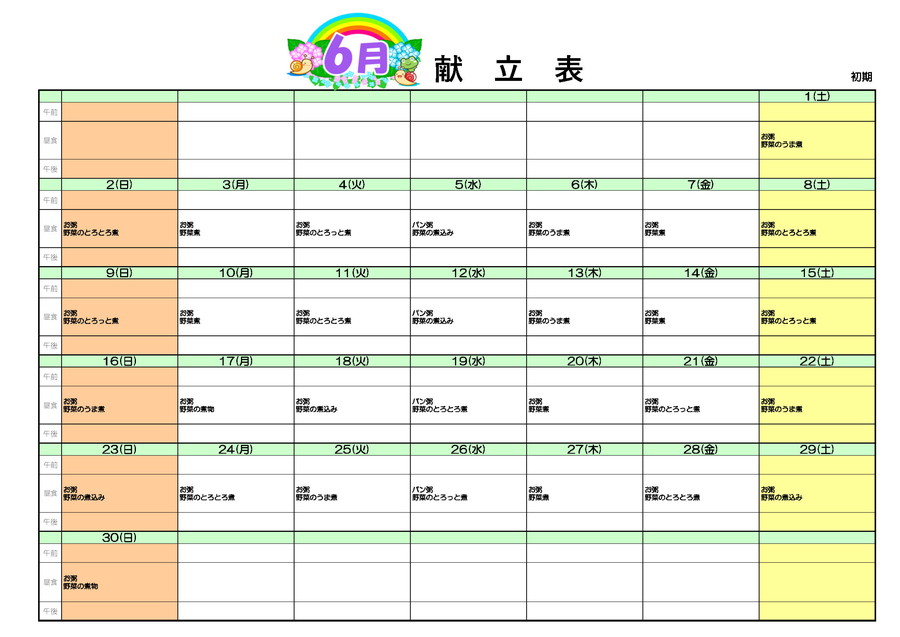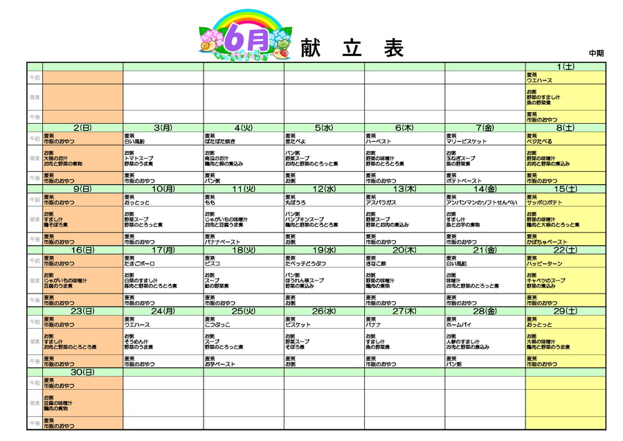 食べる意欲がもてるよう楽しく食事、自分で食べることに積極的に取り組みます。好き嫌いも出てくる時期。いろいろな食材を食べ、味覚の広がりを持つきっかけをつくります。